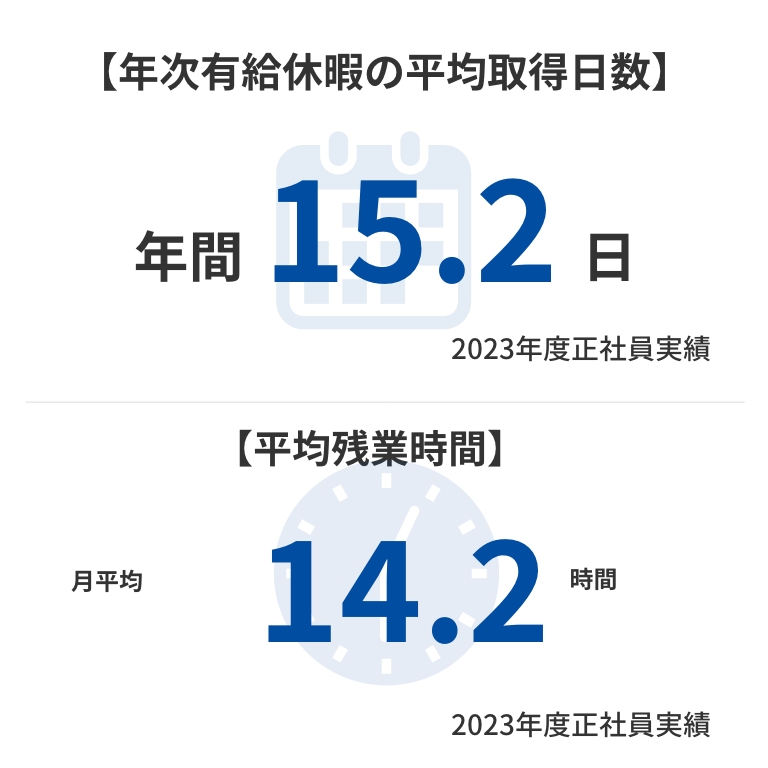 自社ホームページにて健康宣言を行い、社内外にその取組の実績・計画を公表し、社員・家族の健康増進に積極的に取り組んでいます。コロナ対策として社員の時短勤務導入・ワクチン休暇の付与等、特別勤務体制を早期に実現しました。少ない自己負担で本人が希望する住居を貸与する借上社宅制度、各種有給休暇制度、スポーツ奨励金等の福利厚生により、今後も社員が安心して長く活躍できる環境づくりに取組み続けます。